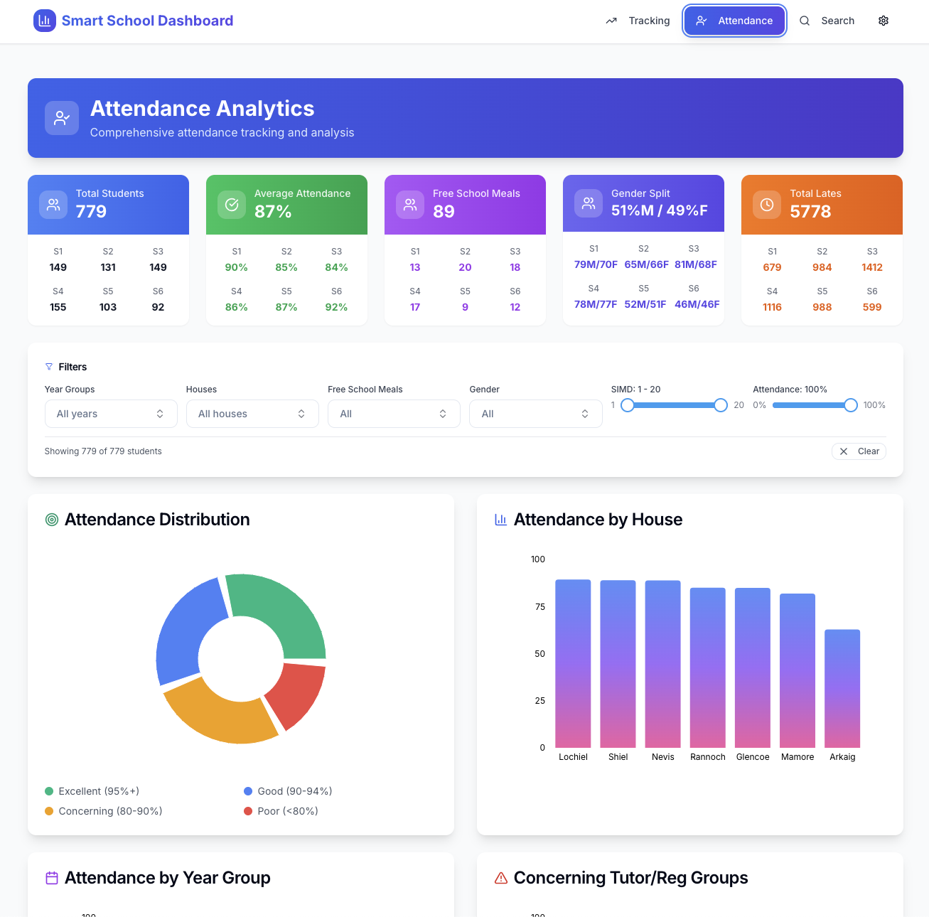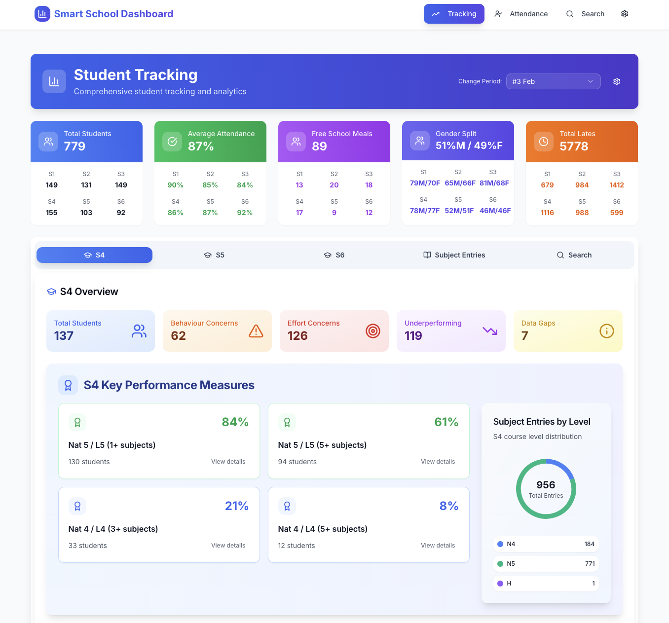 Take a look at the Smart School Dashboard interface. Clean, intuitive, and designed specifically for Scottish education needs.