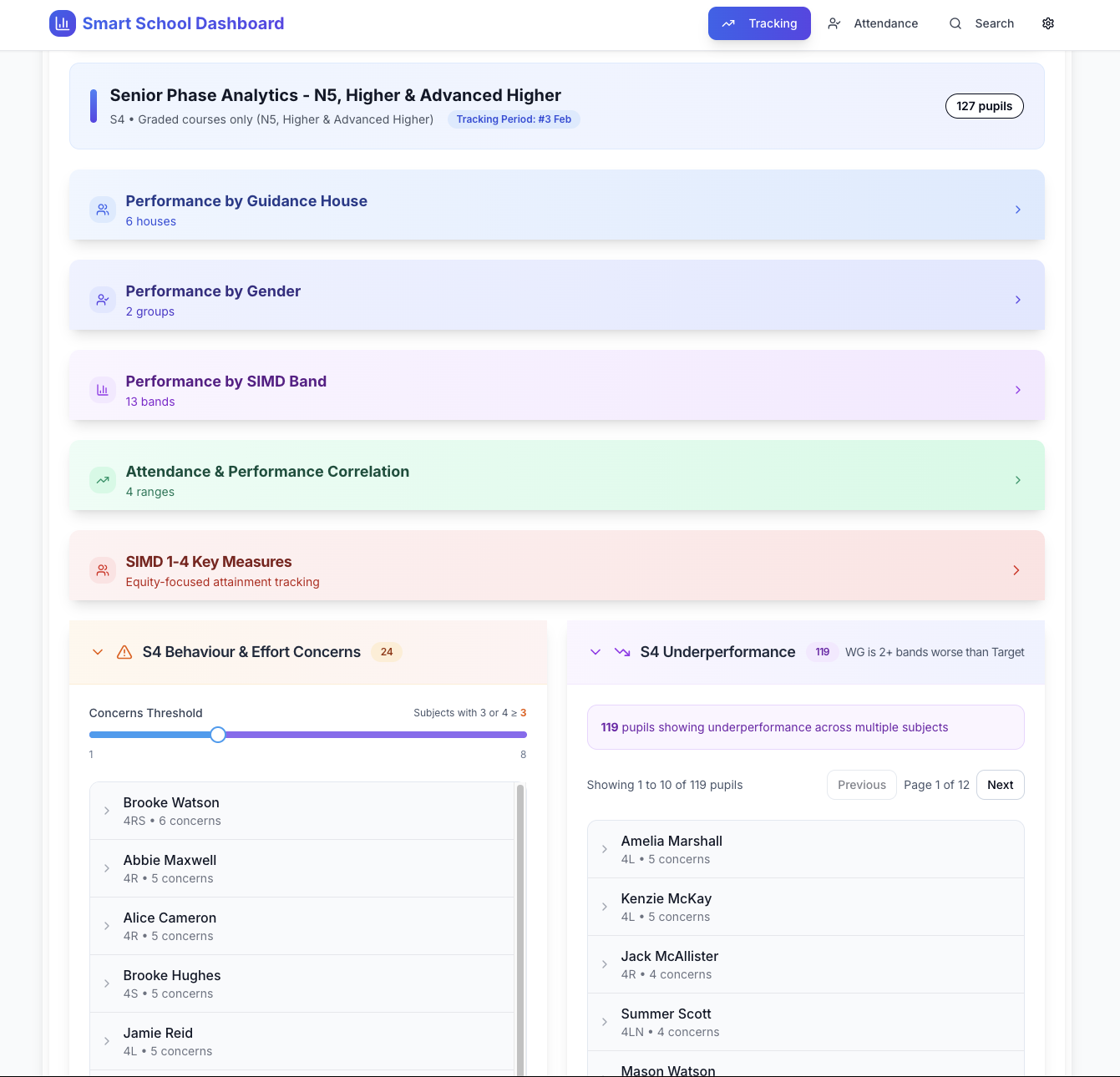 From tracking data and pupil information. Get insights into performance trends, attendance patterns, SQA measures, and demographic analysis all in one place.